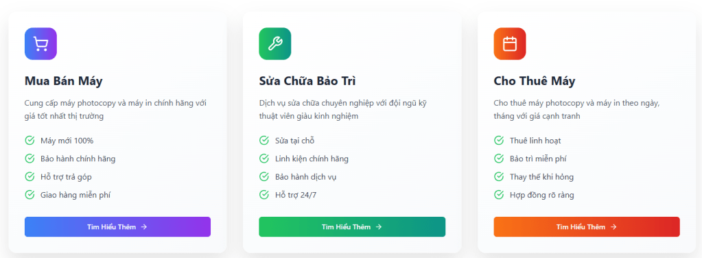 Chuyên cung cấp máy photocopy, máy in chính hãng. Dịch vụ sửa chữa, bảo trì và cho thuê máy chuyên nghiệp với hơn 10 năm kinh nghiệm.
